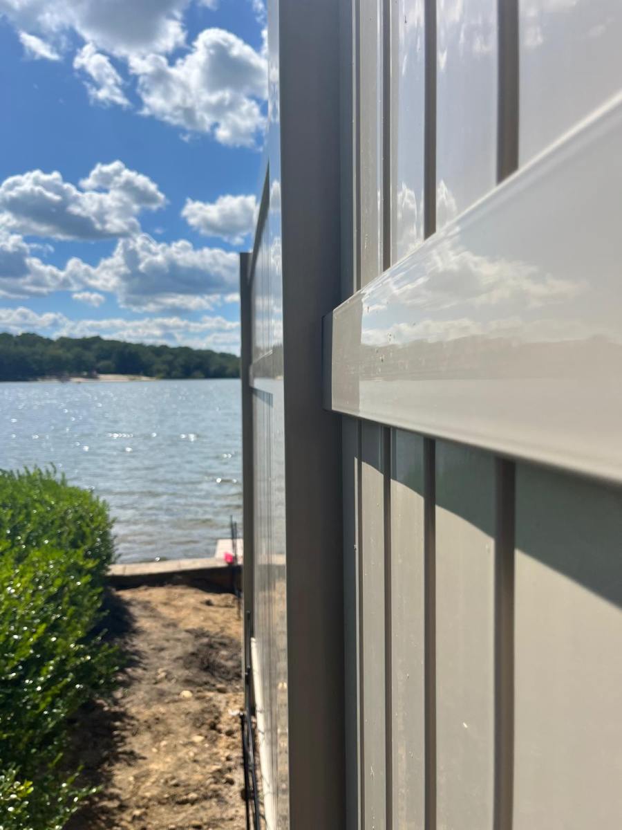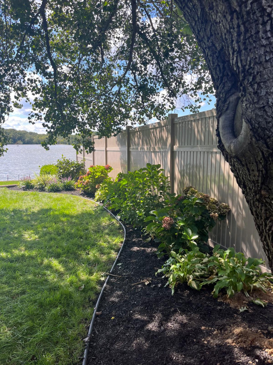 The choice of the Adobe color was also a great decision for this specific landscape. While white is a popular option, Adobe offers a warm and earthy tone that looks like clay. This color blends smoothly with the large trees and flowering hydrangeas seen in Image 3. One of the best parts about our vinyl products is the mono-extrusion process. This means the Adobe color goes all the way through the material. It will not peel, flake, or fade in the sun. For a waterfront home where the sun reflects off the lake, this durability is a major advantage.