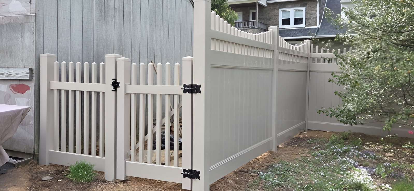 For the rear of the property where seclusion was the priority, we completed the vinyl privacy fence replacement in Broomall, PA using 6-foot panels. These solid sections provide total visual screening from neighboring lots and the street, creating a quiet sanctuary for Mr. Tumolo. We selected a scalloped top for these privacy panels to add a touch of elegance and soften the profile of the taller sections. This wave-like pattern provides a refined finish that matches the heavy-duty black hardware used throughout the installation. Because the material is non-porous vinyl, it will not rot, peel, or require the painting that wood fences demand.